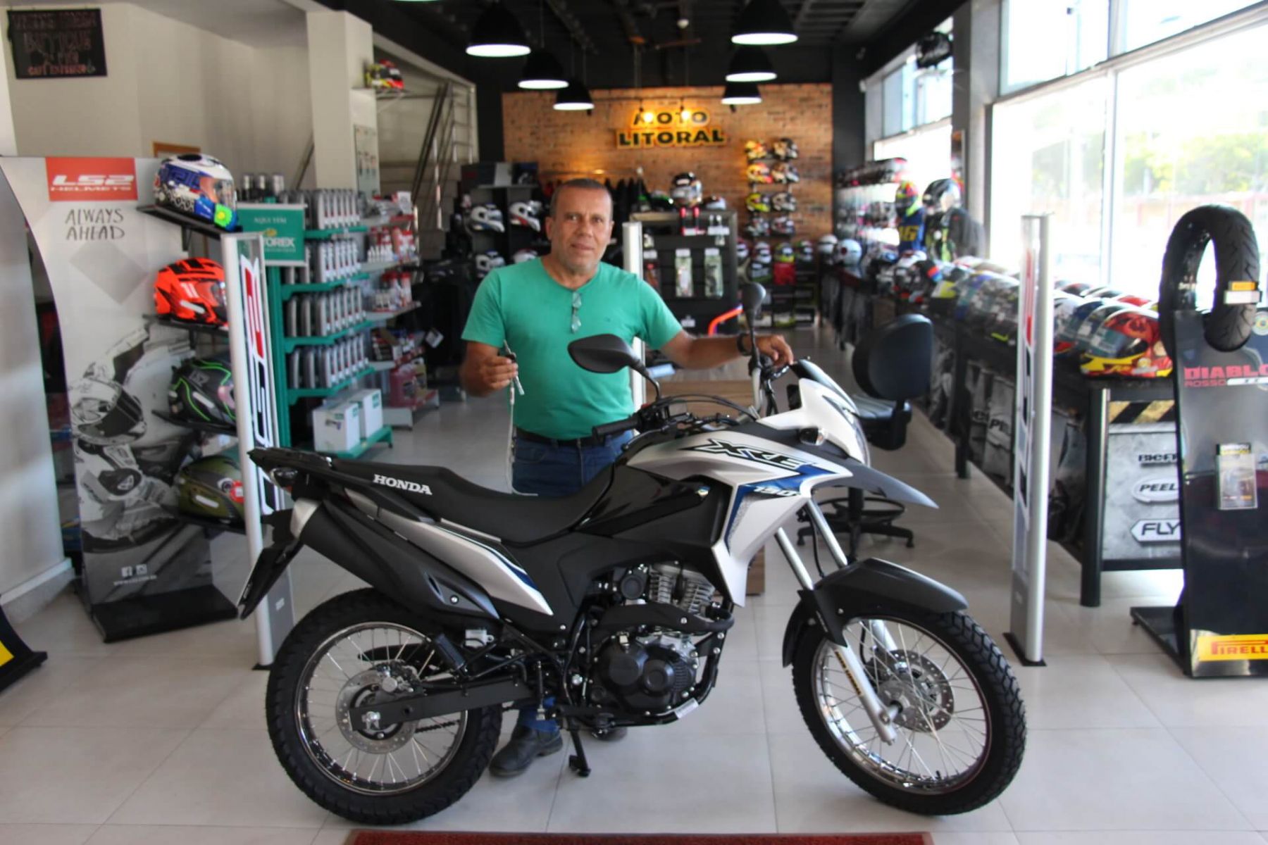 Carlos com sua XRE na Moto Litoral